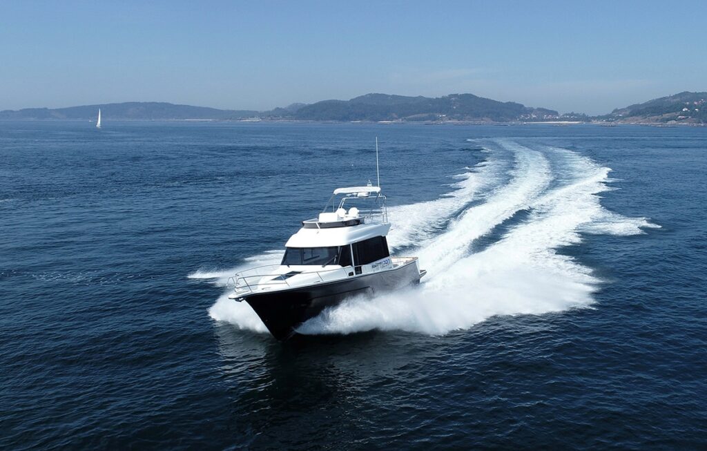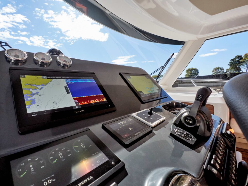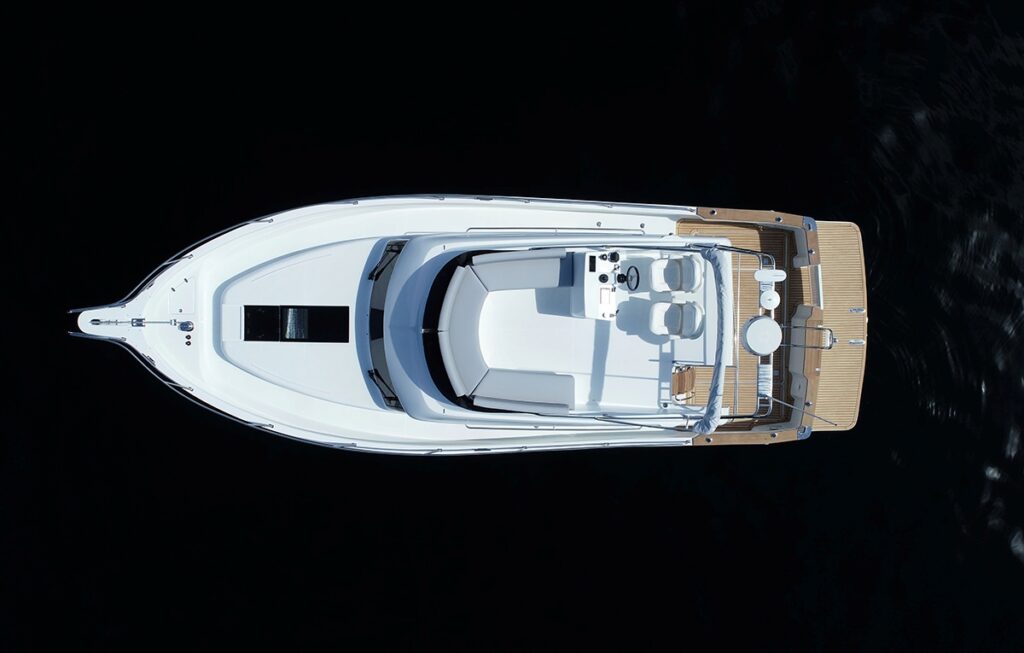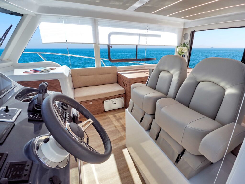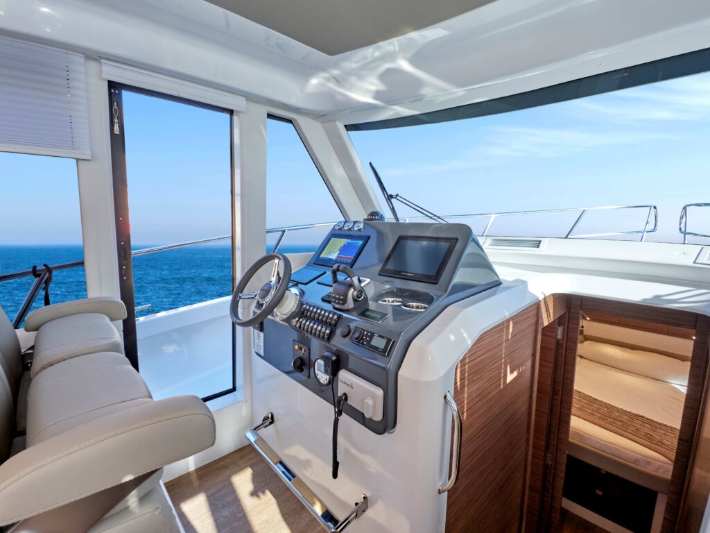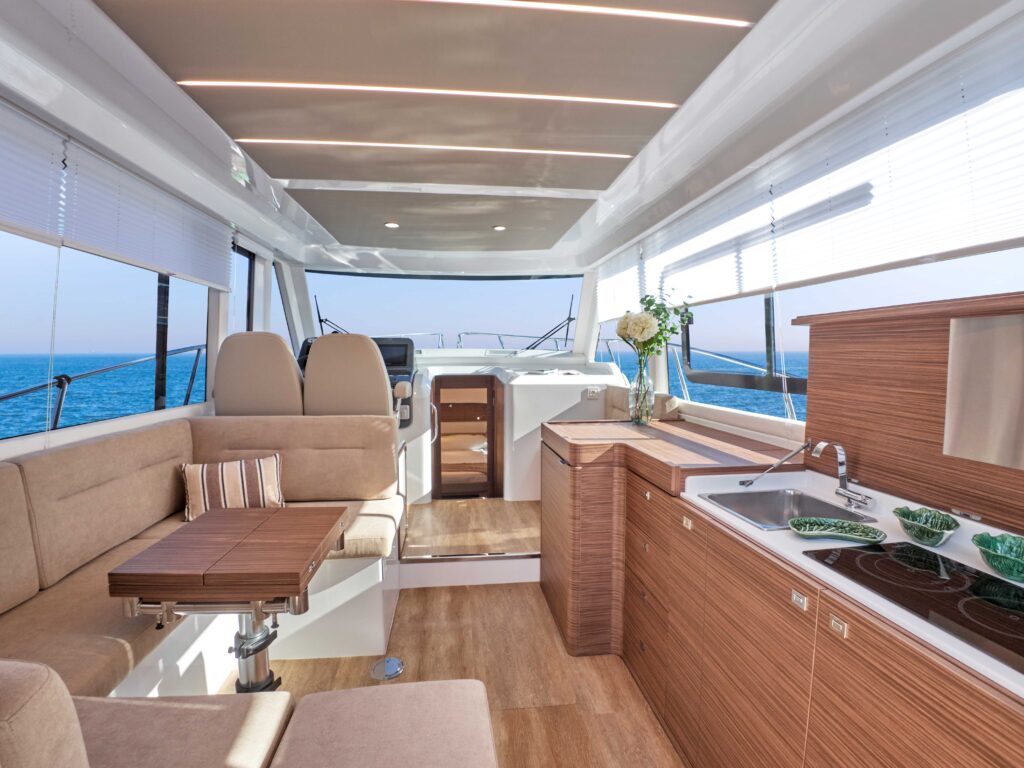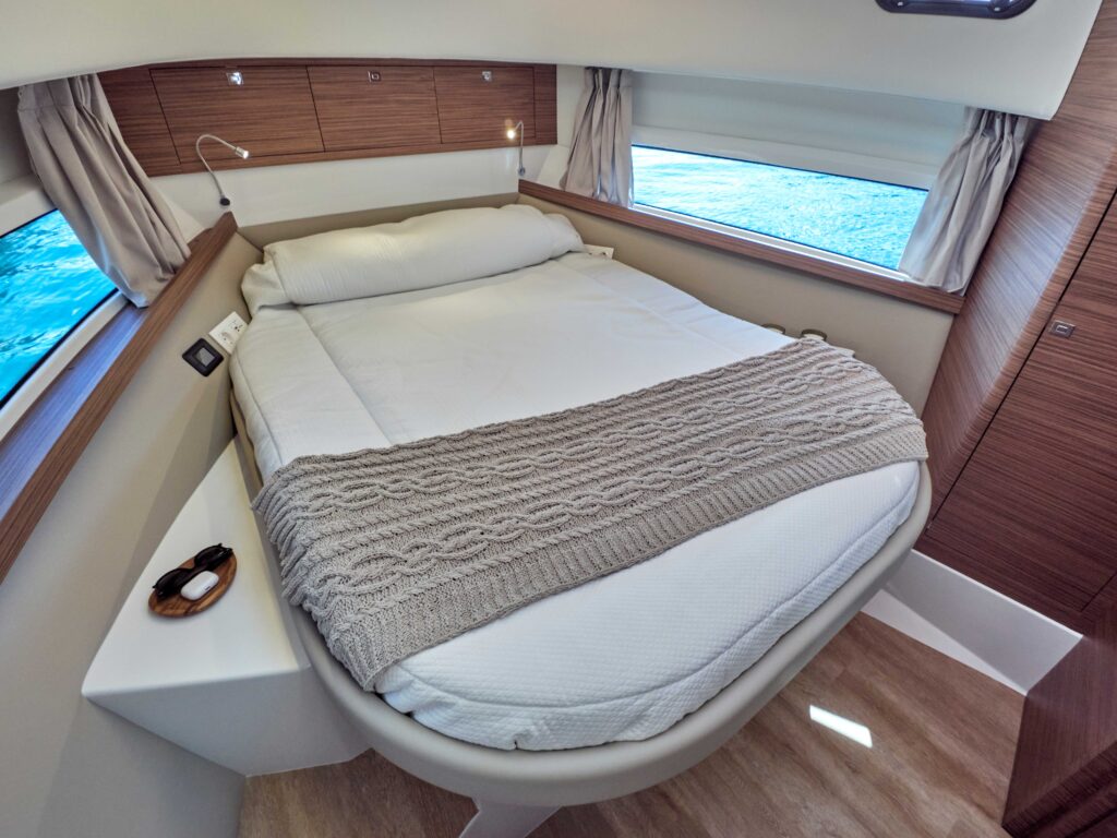i przestronny, z kambuzem umieszczonym na prawej burcie i siedziskiem w kształcie litery “C”, z rozkładanym stołem jadalnym po lewej stronie, który, uwaga, można przekształcić w dodatkowe podwójne łóżko. Całościowo układ obejmuje obszerny kokpit, stanowisko sternika, zarówno w salonie jak i na górze w wersji flybridge. Właścicielska (dziobowa) kabina wyposażona jest