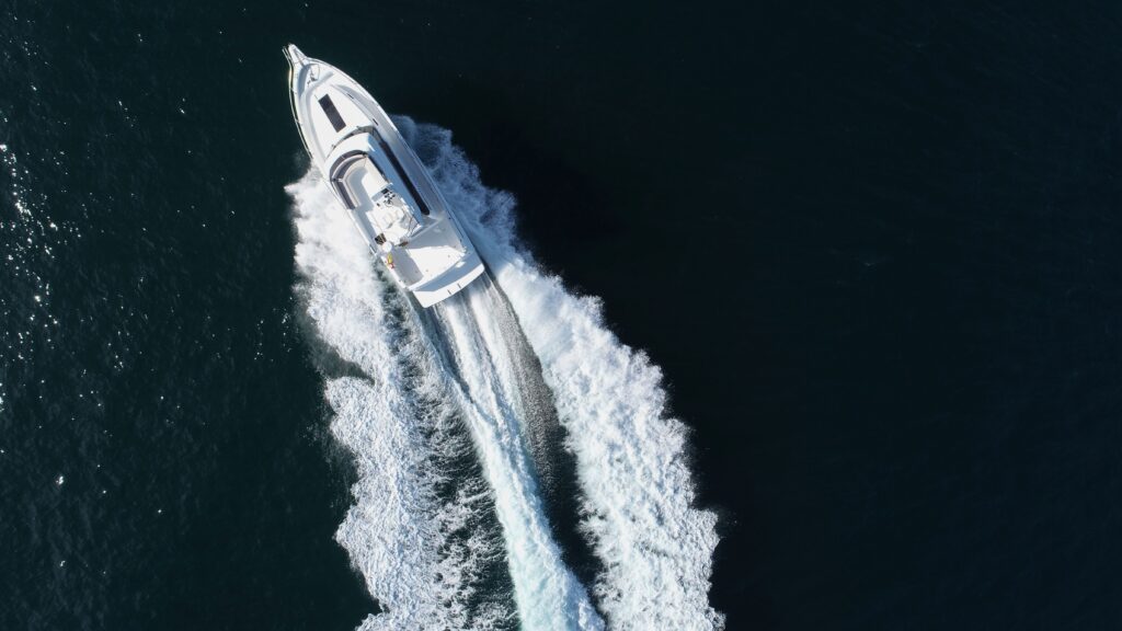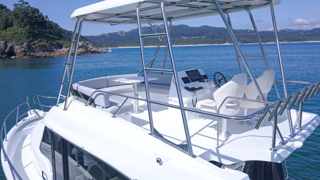 Łódź ma przestronny pokład rufowy i obszerną platformę kąpielową. To w końcu nieodzowny element dobrej zabawy na wodzie. Pomijając flybridge, na jachcie są dwie kabiny dla gości i salon z kuchnią oraz osobna kabina sanitarna. Salon jest jasny
