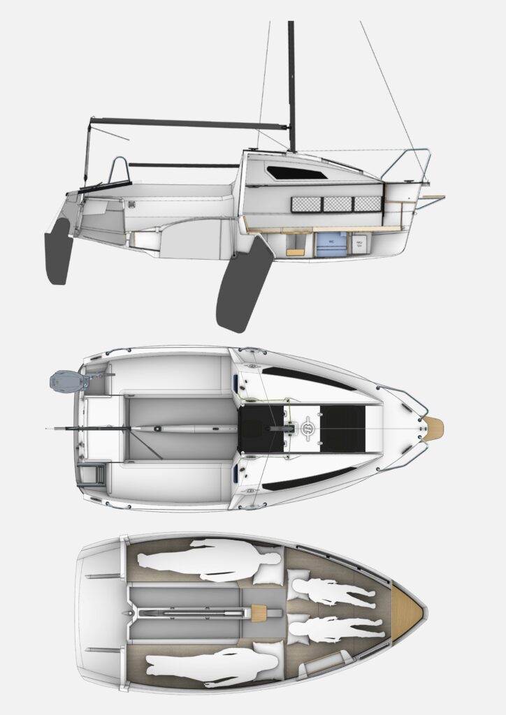 Niecka dna – o niewielkim wyobleniu – płynnie przechodzi w lekko rozchylone burty, na dnie są trzy przetłoczenia – płytki zewnętrzny kil i po jednym wzdłużniku – które: wzmacniają dno, wytwarzają stosowny opór boczny, gdy jacht płynie bez miecza np. na silniku, mają dodatni wpływ na stateczność kursową, a ponadto tworzą zintegrowane z kadłubem „sanie”, pozwalające holować jacht na przyczepie bez łoża. Pomyślano także o hangarowaniu – gabaryt jednostki pozwalają postawić, a właściwe zaparkować jacht – np. na zimę – w garażu [wysokość kadłuba na przyczepie nie przekracza 2 m] o długości 5 metrów i szerokości 2,5 m [maszt zmieści się po przekątnej np. pod sufitem]; stabilnie – bez przyczepy – może stać na wspomnianych już „zintegrowanych saniach dennych”. Płetwy – sterowa i mieczowa – z anodowanego aluminium.