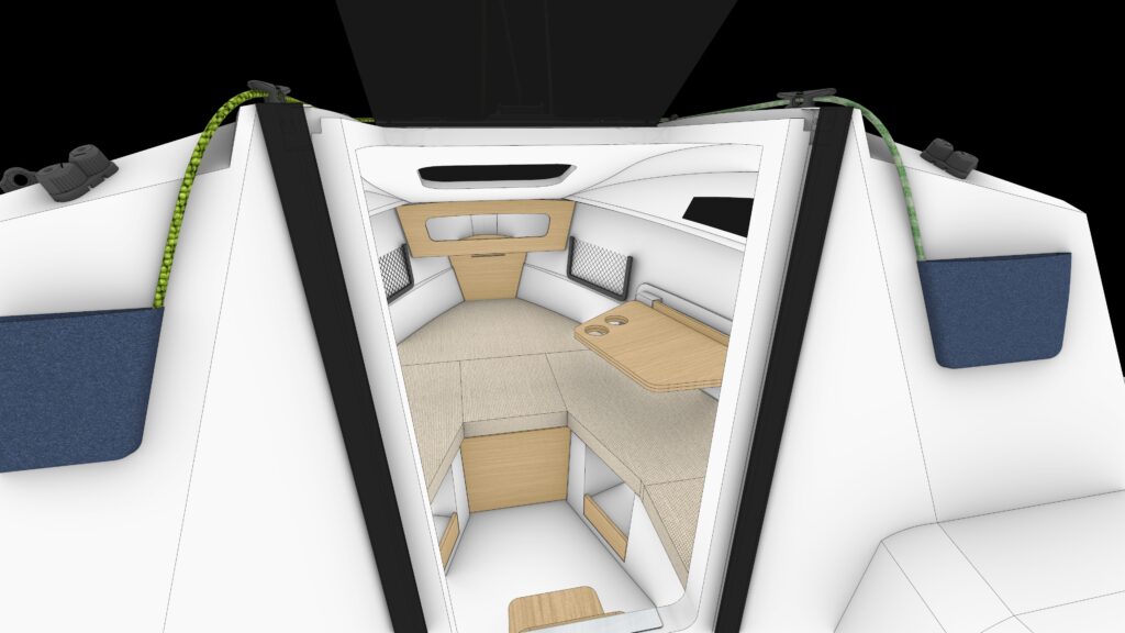 Wnętrze nowego Beza-2” jest obszerne [tu zwyczajowo, dla malkontentów – zabieg stylistyczny – jak na 4-metrowy jacht] – mieści dwie 2-metrowe hundkoje, których fragmenty „kabinowe” służą jako kanapy; na dziobie – szeroka „trójkątna” koja, która mierzy 1,6 metra [wzdłuż burty]. Kształt bryły pokładówki i stosowne wzmocnienia sektorów jej skorupy, obciążanych siłami wywieranymi przez maszt, pozwoliły wyeliminować pilers, co w sposób znakomity poprawia funkcjonalność wnętrza. W sekcji dziobowej [pod koją] wydzielono miejsce na chemiczną toaletę WC oraz przedział na akumulator [zasilanie silnika elektrycznego] lub balast wewnętrzny, który należy „precyzyjnie dobrać” zależnie od masy załogi – to gwarantuje właściwy trym wzdłużny, co jest niezwykle ważne w małej i lekkiej jednostce pływającej. Dopełnieniem wyposażenia wnętrza są jaskółki zamykane „licem” z elastycznej siatki, które zapobiega wypadaniu umieszczonych tam przedmiotów; wysokość w kabinie – 1,25 m. Jacht może być wyposażony w „segment kambuzowy” i demontowalny stolik kabinowo-kokpitowy. Wykonane z odpornego na UV plexiglasu – sztorcklapa zejściówki i uchylna klapa górna, luk dziobowy oraz duże okna boczne – zapewniają dostatek światła we wnętrzu. Klapa górna zejściówki blokowana jest w pozycji otwartej finezyjnym pałąkiem; można ją też wyjąć z zawiasów i schować…