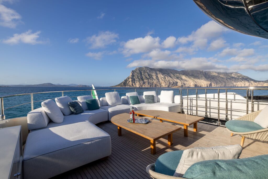 Flybridge jest największym zewnętrznym pokładem jachtu. Tutaj króluje relaks. Na świeżym powietrzu znajduje się bar i jadalnia a w rufowej części swoisty “beach club” z rozkładanymi panelami powiększającymi i tak ogromną platformę. Znakomite połączenia wewnętrznych i zewnętrznych pomieszczeń na całym F100 doskonale integrują wszystkich mieszkańców jachtu. Ekskluzywne i wygodne kanapy na dziobie i rufie tworzą niezależne, klimatyczne tarasy słoneczne. Strefy na F100, te wypoczynkowe, sypialne, miejsca przeznaczone do relaksu w większych i mniejszych grupach są jednocześnie idealnie połączone i dające niezależność codziennego funkcjonowania na pokładach. To kolejny dowód na niezwykle przemyślany projekt tej jednostki.