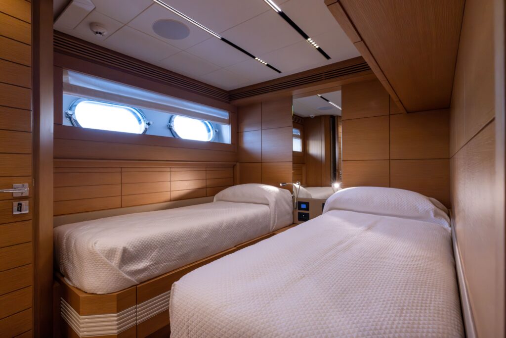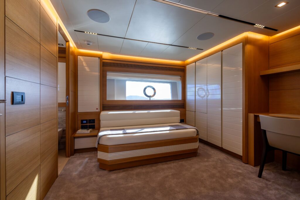 Jacht składa się z kilku poziomów. Najniższy z nich, to głównie część sypialna. Warto nadmienić w tym miejscu, że ciągi komunikacyjne na jachcie i układ kabin gwarantują użytkownikom pełną swobodę, ale również intymność i tak potrzebny czasami komfort chwilowego odosobnienia. Załoga, goście i obsługa w żadnym razie sobie nie przeszkadzają, ani w obowiązkach ani świetnej zabawie. Sypialnie dla załogi znajdują się w dziobowej części jednostki. Na głównym pokładzie z kolei znajduje się stanowisko prowadzącego (skipera) , wyposażone w najnowocześniejsze, dostępne na rynku wyposażenie nawigacyjne i plotery informacyjne oraz wspomniany apartament właścicielski. Nie zapominajmy jednak, że właściciel ma wpływ na dobór pewnych elementów w tym z pewnością elektroniki pokładowej. Ten poziom to też jadalnia i ogromny salon z kanapami. Strefa wypoczynku i podziwiania widoków przez duże, ekranowe wręcz okna wzdłuż obydwu burt. Łatwo sobie wyobrazić poranne, urocze spotkania przy kawie całej załogi na tym pokładzie.
